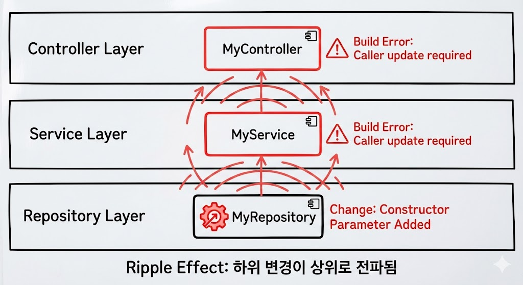의존 대상의 생성자 파라미터가 하나만 바뀌어도, 그 객체를 new 하던 모든 지점을 수정해야 했습니다.